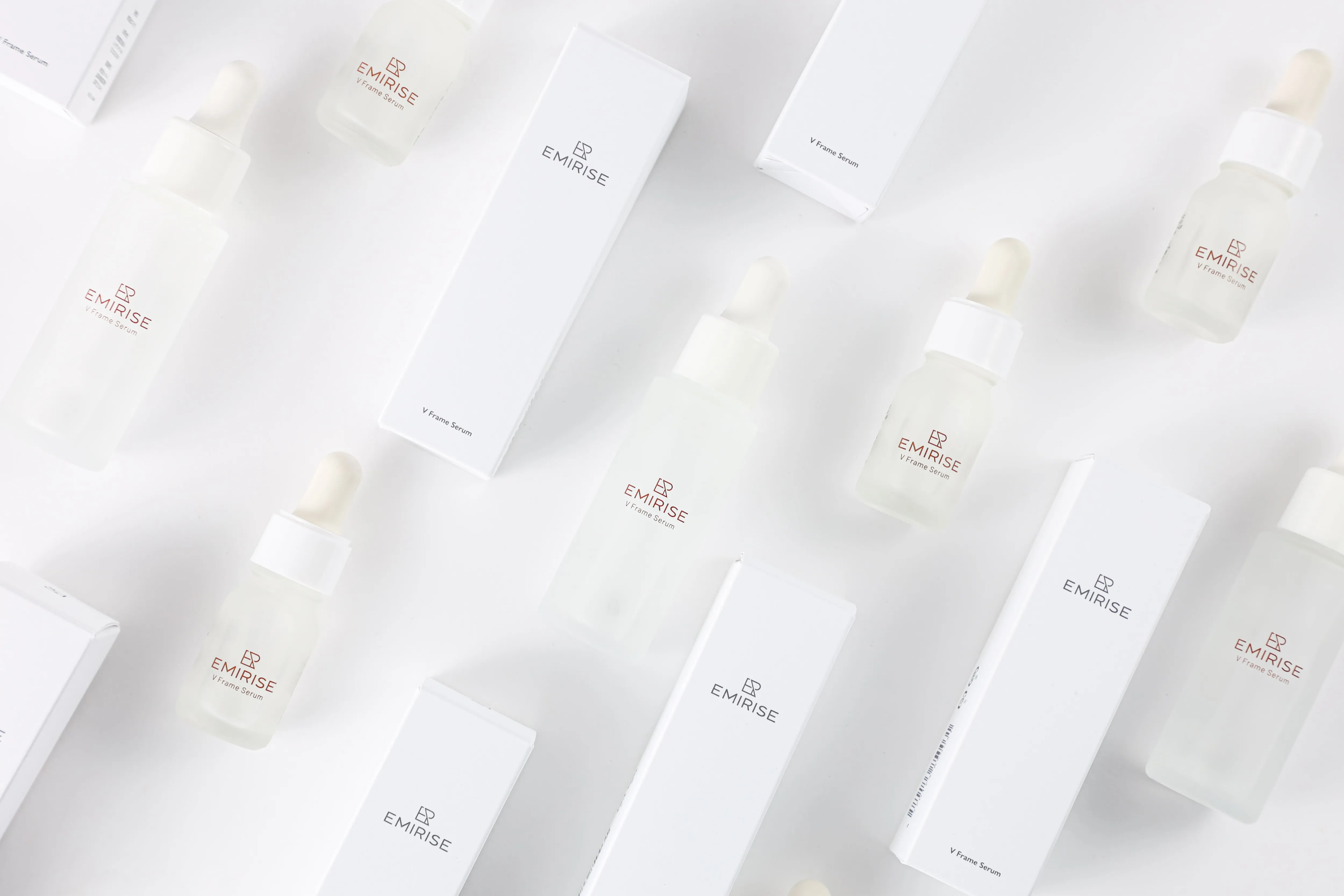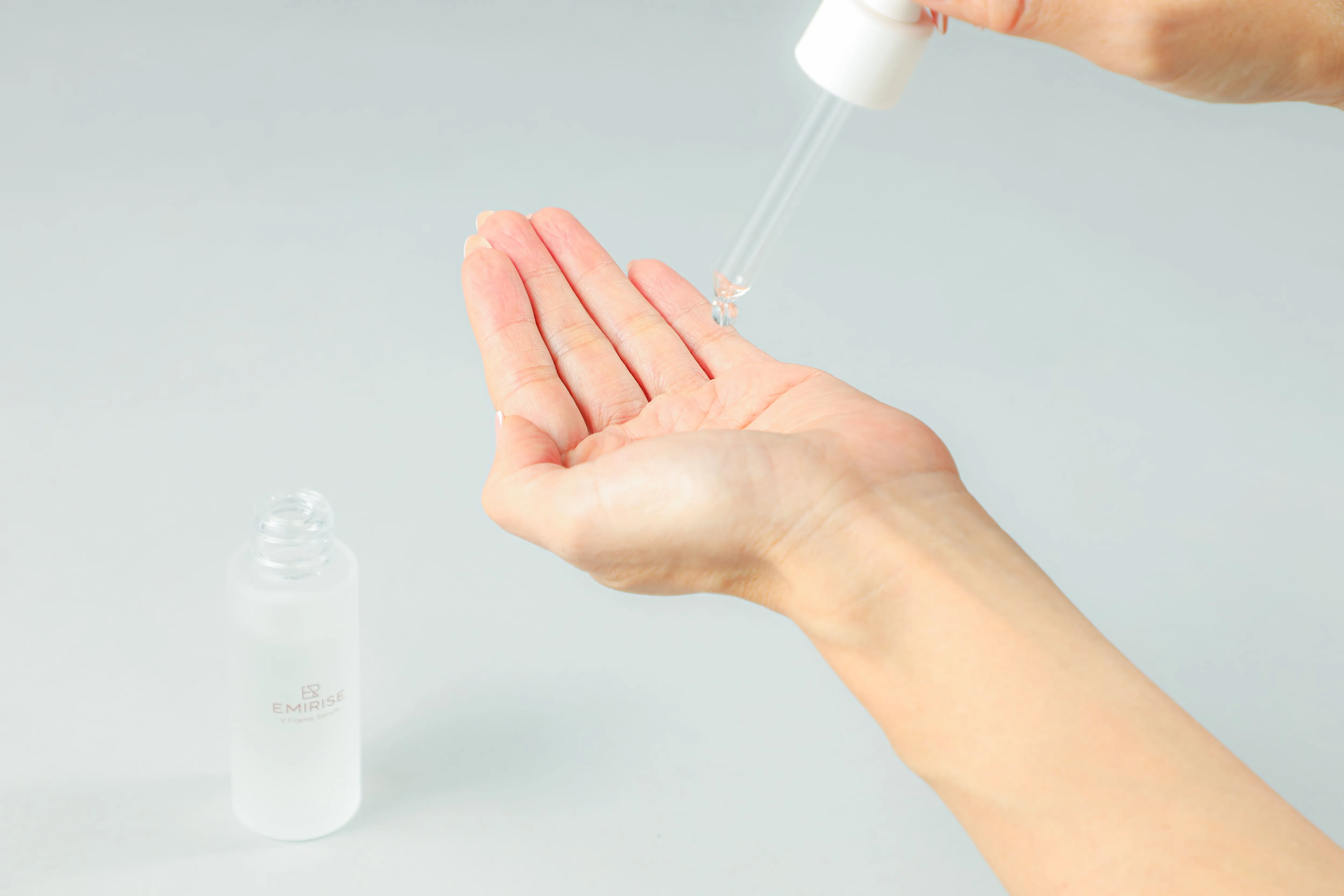 こちらのカットでは、実際に美容液を使用するシーンを切り取ることで、商品のリアルな使用感と肌へのやさしさを視覚的に伝えることを意識して撮影いたしました。ポイントは、スポイトから落ちる美容液の一滴を美しく見せることです。液体の透明感が伝わるように、ライティングは柔らかい光を使いながらも、スポイト部分には少しハイライトが入るように調整し、滴がきれいに見えるように調整を繰り返しました。これにより、美容液のみずみずしさや軽やかなテクスチャーを表現しています。