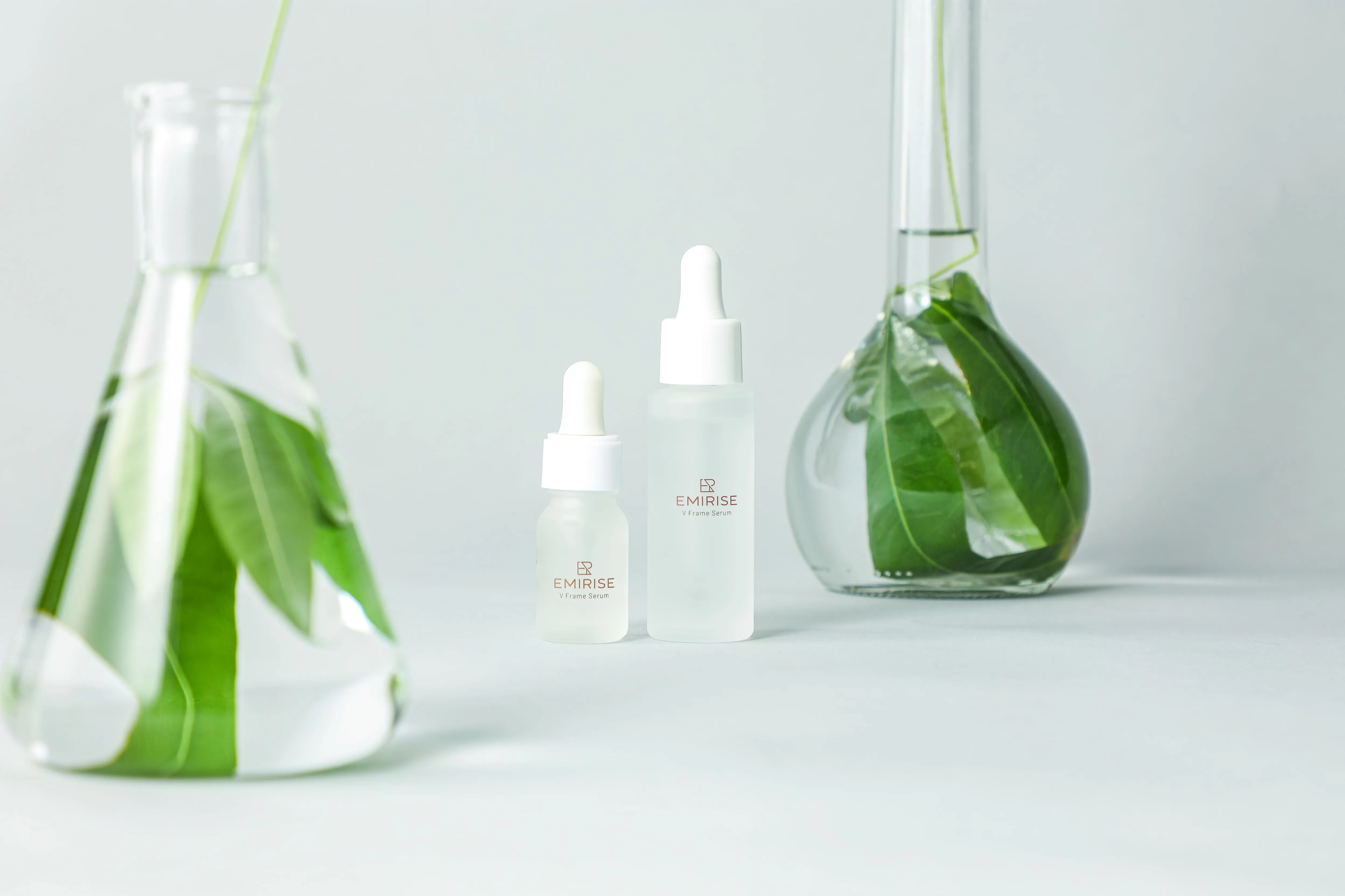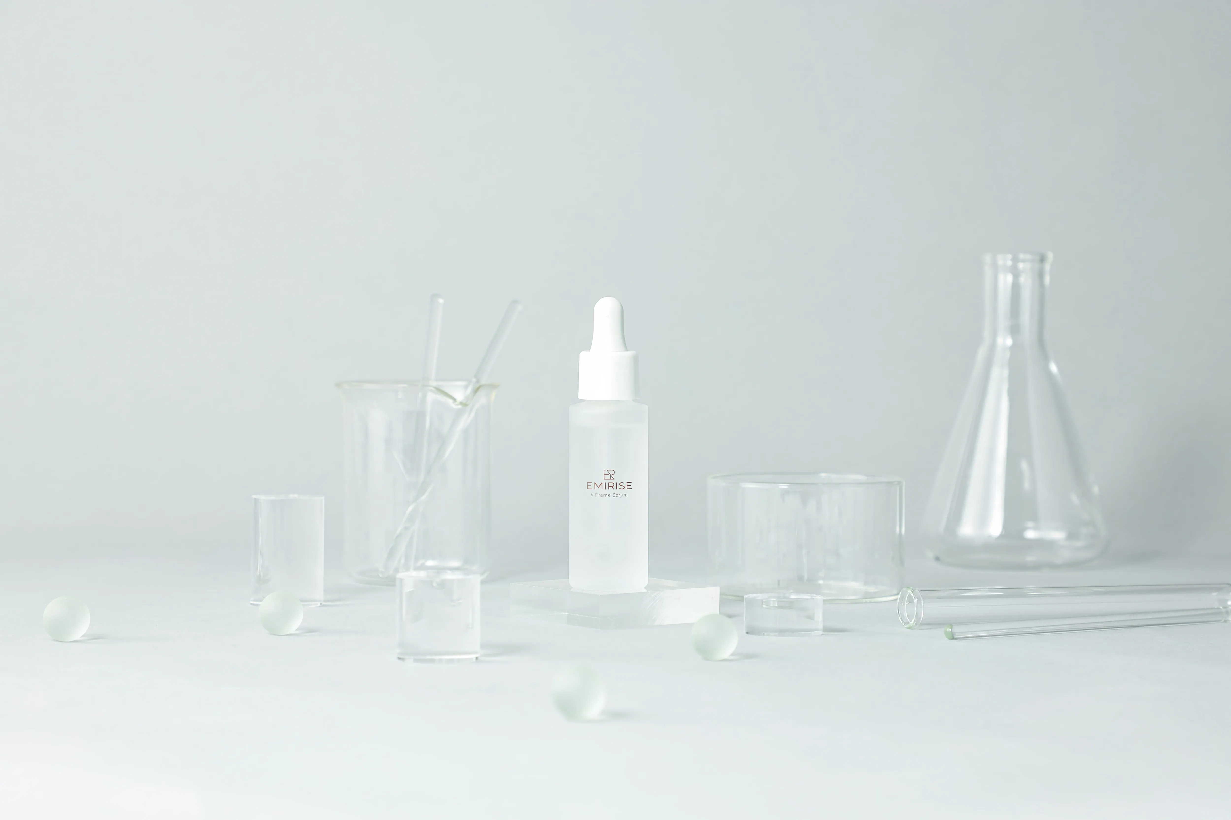 こちらのカットでは、商品の持つ「クリーンさ」と「サイエンス感」を表現するため、科学器具のガラス素材を周囲に配置し、世界観を演出しました。透明感のあるビーカーやフラスコを使うことで、スキンケア成分の純度や信頼性を視覚的に連想させています。ライティングでは、できるだけ柔らかくフラットな光を使用し、影を強く出さないように調整しました。これにより、商品のボトルのマットな質感と透明感が自然に際立つようにしています。構図のポイントは、中央に商品を据えつつ、周囲のガラス器具をあえて少しランダムに配置することです。これにより、静物写真でありながらも自然な動きと奥行きを生み出しています。前景に小さなガラス球を入れることで、さらに奥行きを作り、視線が中央の商品へ自然に集まるように仕上げました。