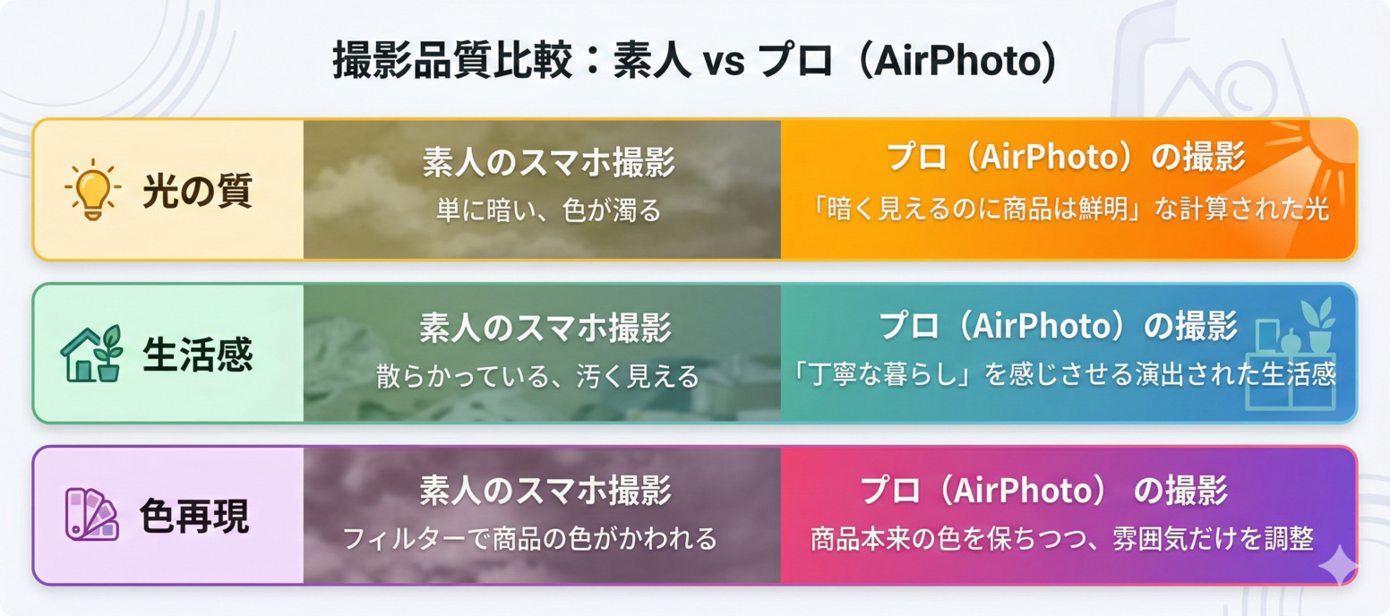 - 素人撮影ではなく、AirPhotoのプロ技術で「計算された自然」を作る。
